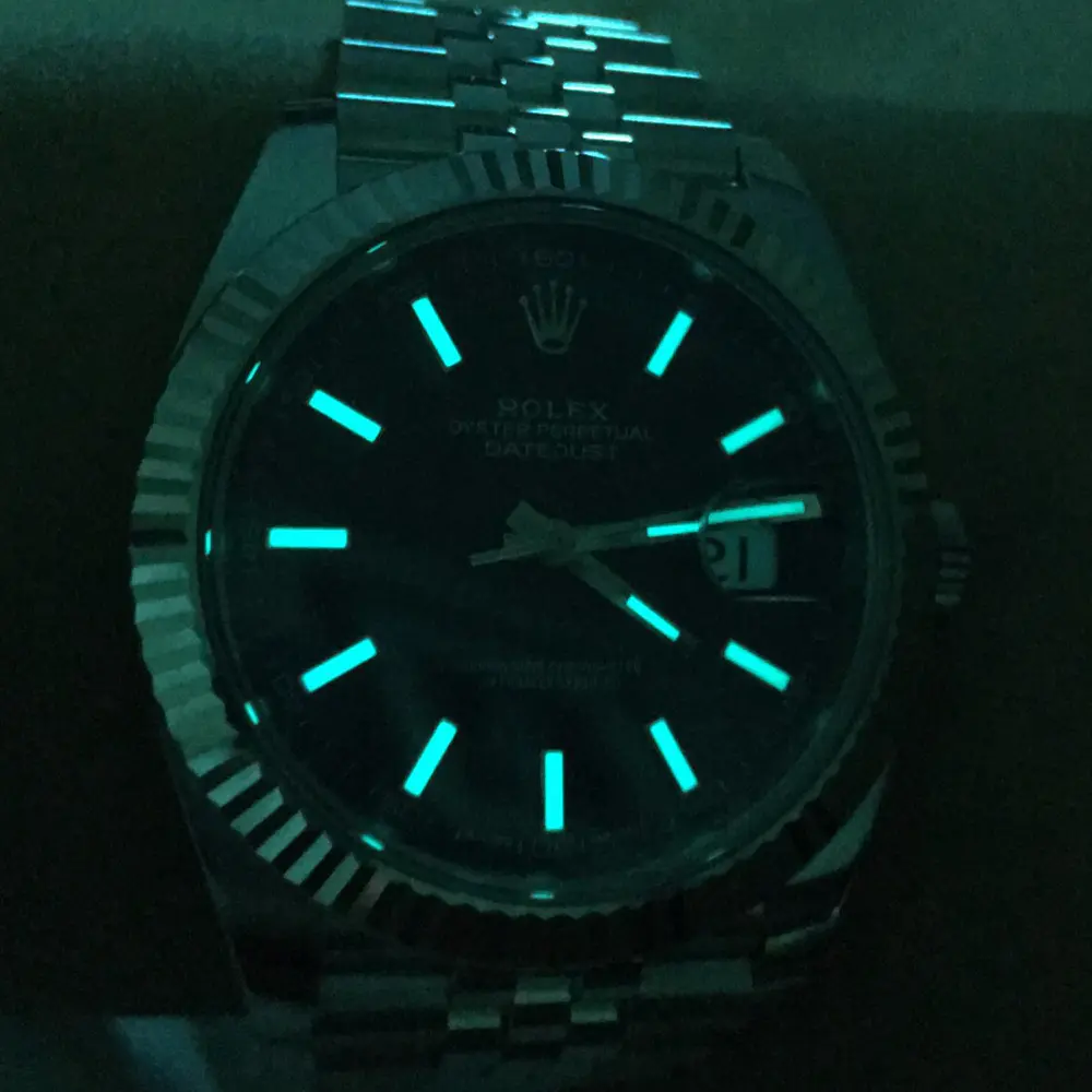 Rolex Datejust Swiss Replica watches are equipped with the new SuperLuminova™ Blue glow luminescent pigment that after sufficient activation by sunlight or artificial light will glow in the dark up to nine hours with uniform luminosity throughout.